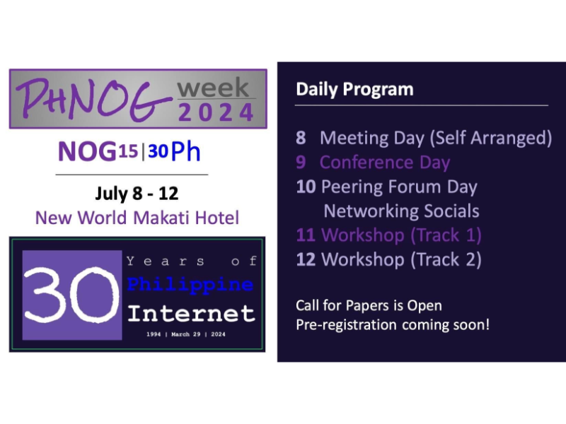 - The Philippine Network Operators Group (PhNOG) is celebrating 30 years of the Philippine Internet with its bi-annual conference, PhNOG 2024 Week, from July 8 to 12 at the New World Makati Hotel, gathering a wide range of internet professionals from both public and private sectors.