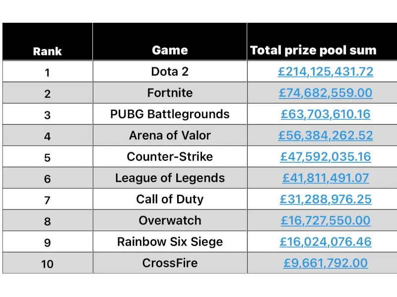 - #2:Second place went to Fortnite with 74,682,559 pounds.The game, which was only released in 2017, has already hosted 63 tournaments specifically for the sport, with more than 6,800 players participating in those tournaments. On average, the winner of a Fortnite tournament can expect to rake in around £1,185,437 – and while that’s still a huge sum, it’s more than 65% below the Dota 2 average.