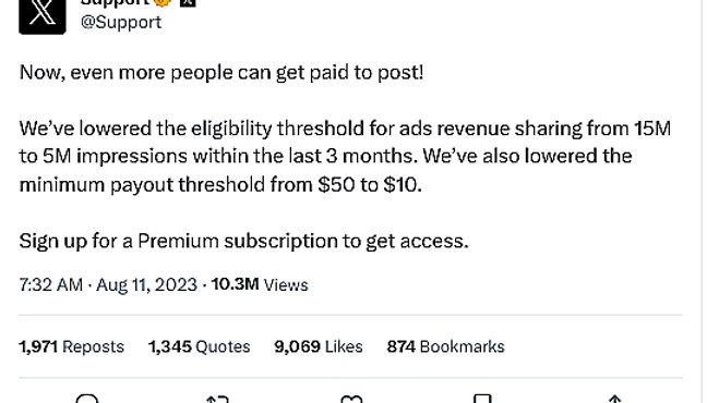 Shortly after the payouts were released, Elon Musk, in a @Support post, announced notable changes to the program’s terms. The minimum payout threshold has been reduced to $10, and the minimum impressions requirement within three months has been lowered from 15 million to 5 million views.